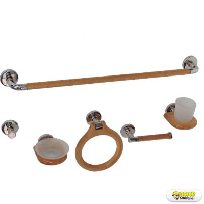 6 componente: port prosop inel, cuier de baie, port sapun, port hartie, port pahar simplu, port prosop simplu. Realizate din alama cromata si sticla mata.