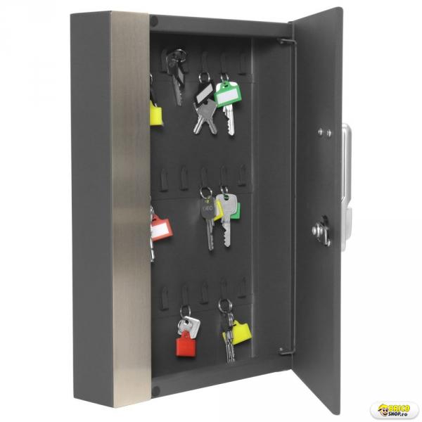 Panou depozitare chei Rottner Key Home cu corp din otel, se poate monta atat aparent pe zidarie cat si incastrata in zidarie. Corpul cutie de chei Key Home este construit din tabla de otel, vopsita in camp electrostatic, rezistenta la uzura. Usa este prevazuta cu sistem de inchidere electronic pe baza de cifru. Se pot utiliza mai multe coduri pentru utilizatori si un cod master. Panoul incastrabil de chei Key Home contine 24 agatori pentru chei. Dimensiuni exterioare 385x265x60 mm. Dimensiuni interioare 370x250x45 mm. Greutate 2.5 kg. Unghiul de deschidere al usii este de maxim 90 °, balamale la interior. Acest model de panou depozitare chei Key Home este prevazut cu 4 gauri de fixare in partea din spate, kitul de montare fiind inclus in setul de livrare.
