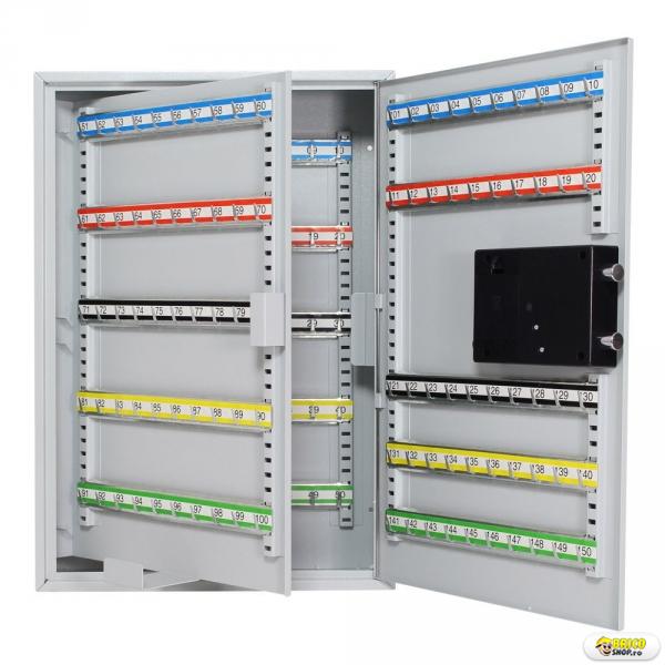 Panou depozitare chei S 150 EL, din tabla de otel vopsita in camp electrostatic. Incuietoare electronica pe baza de cifru. Compartiment de baterii in interior.(4xAA) Bateriile panoului de chei S 150 EL nu sunt incluse in setul de livrare. Prevazut cu cheie de urgenta, in caz in care s-a uitat codul cifrului sau bateriile sunt descarcate. Dimensiuni 550x380x140 mm. Greutate 9.2 kg. Numar agatatori chei 150. Unghiul de deschidere de maxim 90 °, balamale montate la interior. Culoare panou depozitare chei S 150 EL gri deschis RAL 7035. Acest model de dulap pastrare chei S 150 EL este prevazut cu 6 gauri de prindere in partea din spate, pentru fixare in perete sau suport. Kitul de montare este inclus in setul de livrare.
